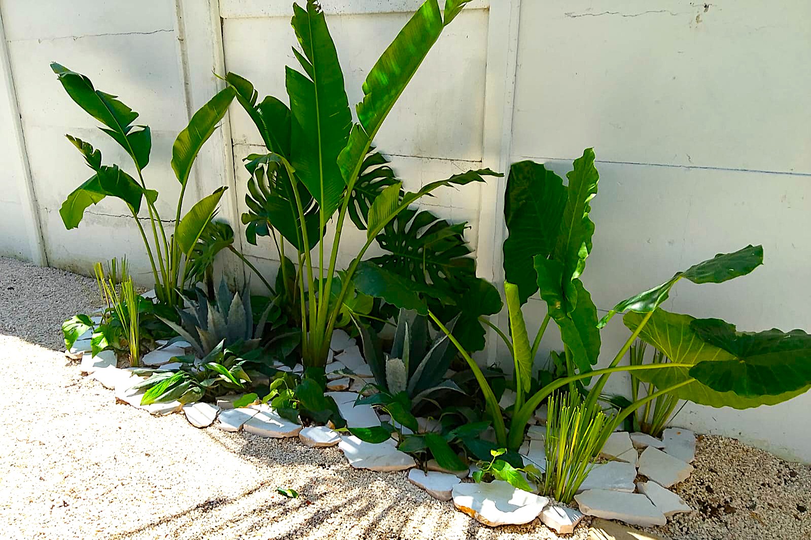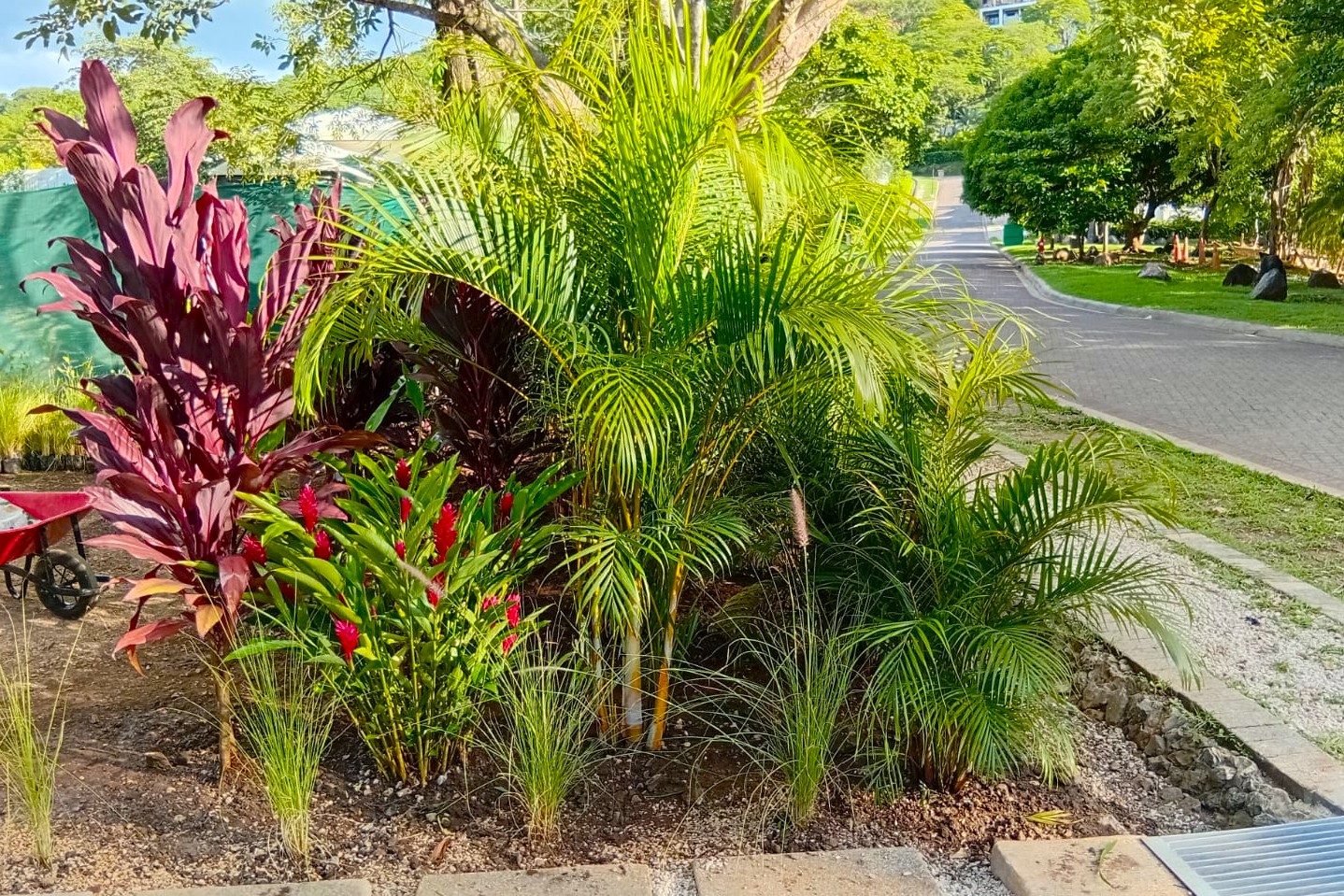 Mid-level plants are what give the tropical bed its fullness. In landscaping in Guanacaste, this layer should feel dense but controlled.